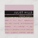 A trendy square business card featuring glittery blush pink and gold stripes on a blush pink background. Your contact details, including phone, email, website and social media handle are on the reverse side. You can customise further to remove icons for social media that you do not use, and reposition icons if necessary.