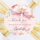 A girly blush pink background, decorated with a large pink bow and pink flowers. Text: Thank you for sharing my special day. With a small heart. Personalise and add your name.
