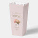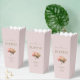 Delight wedding guests with a surprise midnight snack. This lovely wedding favour popcorn box features a floral rose bouquet and contemporary set of fonts in olive green, against a blush pink background.