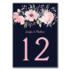 Elegant blush pink watercolor flower header on a navy background table number cards. A modern take on a chic, elegant design using calligraphy and modern fonts with pink and white text.