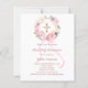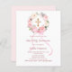 White background, decorated with watercolored pink and white flowers in a wreath and a golden cross. A pink bow. Personalize and add a name and details.