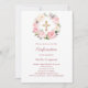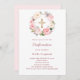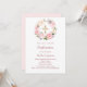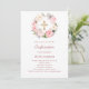 White background, decorated with watercolored pink and white flowers in a wreath and a golden cross. Personalize and add a name and details.