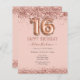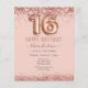 Girly glitter, millennial pink background, with fancy script name typography. Faux rose gold 16 balloon text. Pink Roses and butterfly top border. Great for sweet 16 celebrations.