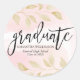 Feminine and modern envelope seal for graduation invitations and announcements. The design begins with a soft pink blush watercolor background. Soft gold leaves and branches define the top and bottom of the sticker. Graduate is written in a handwritten script font. The graduate's name, school and graduation year are written below in a classic font combination.