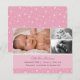 Three photographs bordered by white rules are perfect for showing off the little one three times over! A light pink panel holds your information with tonal pink rounded squares to accent this announcement. Have that adorable little face printing in all three panels or show those cute little hands or toes in addition. Add your customised information below and you're all set. Available in alternate colours with matching products.