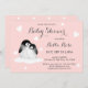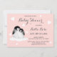 Baby shower invitation features a pair of penguins and dainty white hearts scattered on a soft pastel colour background. Personalise with your invitation detail in grey. Use customise/personalise button to change font style, size or colour.