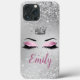 Blush Pink Glitter Eyes Monogram Phone Case features a Silver Queen's Crown and a pair of eye lids with Blush Pink glitter eyeshadow, diamanté effect liner with long black lashes on a silver glitter effect background. Personalize with the name of your choice in matching Blush Pink. Designed by Jacqueline. Personalized by you.