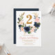 Design features beautiful watercolor floral elements in shades of blush pink, navy blue and eucalyptus greenery, gold leaf elements.