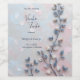 This wedding wine label features a graceful branch with muted blue and beige leaves, set against a soft pastel pink and pearl-toned background. The textured composition blends natural elegance with a dreamy, minimalist aesthetic. Perfect for modern, nature-inspired themes or designs that evoke serenity and subtle sophistication.