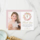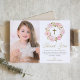 Blush Pink Peonies Wreath First Holy Communion Thank You Card. Customisable thank you flat card featuring pink watercolor peonies and roses with foliage, twigs and baby's breath accent. This floral photo thank you card will also be perfect for Baptism and Christening thank you card.
