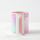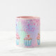 A trendy holographic, iridescent background with unicorn colours and rainbow colours in pink, purple, mint green. Decorated with confetti in pink and 3 cupcakes. Personalise and add your name. The name is written with a modern hand lettered style script with swashes.