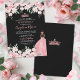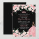 Tiara Watercolor Floral Pink Quinceañera Invitation. This charming design features watercolor blush pink roses and flowers mixed with green leaves and foliage, creating a whimsical yet elegant look. A sparkling pink princess tiara sits at the top, and an adorable girl in a pink sparkling dress appears on the back. Classic serif and script fonts add sophistication, all set against black backgrounds on both sides for a striking, elegant effect. All fonts and colors can be customized.