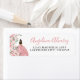 This sweet return address label features a watercolor design with blush pink roses, green leaves, and a girl in a sparkling pink dress with a tiara, all placed on the left side. Your name appears in a soft pink handwritten script, while the address is printed in a classic black serif font on the right. The delicate floral artwork and whimsical princess theme create a charming and elegant look, perfect for Quinceañera invitations, birthday parties, bridal showers, or special thank you notes.