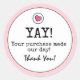 If you’re looking for a colourful, perhaps unique and sweet way to thank customers for their purchase, you might appreciate this fun retro inspired Blush Pink “Yay! Your purchase made our day!” (With Heart) Business Thank You Classic Round Sticker from Zazzle! Available in small sheets of 20 and large sheets of 6 in glossy or matte finish. Sold by the sheet or in quantities of 2-500 (sheets). Buy them as is or easily customise the text on the front to meet your gifting needs. Perfect to add to envelopes, packaging, gift bags and more! Save when you buy more - no minimums. 100% satisfaction guaranteed.