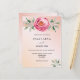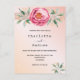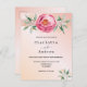 A rose gold and blush pink gradient background. A large pink watercolored rose, green leaves, foliage with small golden flowers. Personalise and add your names and wedding details. Black letters.