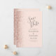 The left-hand edge of this elegant modern wedding save the date card features a rose gold faux glitter border. The customisable text combines charcoal grey handwriting, copperplate and italic fonts on a blush pink background. The reverse side features a matching blush and rose gold design.