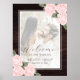 Elegant rustic blush floral wedding photo welcome sign featuring blush pink roses and baby's breath framing the wedding details and a photo against a rustic wood background. Matching items available.