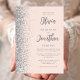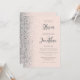 The left-hand edge of this elegant modern wedding invitation features a silver faux glitter border. The customisable text combines grey script and sans serif fonts on a blush pink background. The reverse side features a matching blush and silver design.