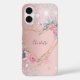 A blush pink background. Faux silver glitter dust as decoration. A golden heart decorated with pink flowers. Personalise and add a name. The name is written a modern grey coloured hand lettered script.