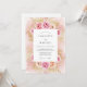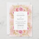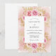 This design features a soft watercolor wash in delicate shades of blush pink and peach. Lush roses in varying hues of pink create a romantic border, accented by elegant golden-toned foliage and leaves. The overall aesthetic is ethereal and refined, making it ideal for a spring or summer event.