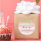 Round sticker for baby shower favour with faux gold glitter and blush pink stripes background.