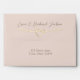 Simple, elegant, blush pink 5x7 envelope for wedding invitations with return address, modern calligraphy script and gold rope heart.