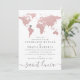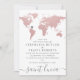Pretty muted blush pink world map destination wedding invitation with a heart location marker you can move to mark your wedding location and create an elegant pink and grey travel theme invitation for a local at-home reception or destination wedding.