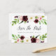 Elegant watercolor floral save the date postcards feature "save the date" in chic calligraphy with your names and wedding date beneath, accented by top and bottom borders of watercolor flowers in burgundy marsala and blush pink with lush green leaves and foliage.