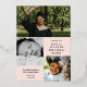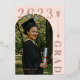 Elegant rose gold graduation invitation in blush pink personalised with one photo on the cover and three more photo on the back. Double sided graduation invitation printed with rose gold foil against a pale pink background with the graduate's photo in an arch shape and a pretty rose gold arrow. Graduation invitation personalised with photos and the graduate's name in rose gold foil.