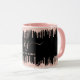Girly, Elegant, Sylish Blush Rose Gold Glitter Drips 2 Monogram Script custom personalised name monogrammed mug. Featuring a modern luxury faux blush pink rose gold glitter dripping frame, a large double hand lettered monogram script font with swashes (large size initials), and a serif type font name in pink on black background. Easy to personalise it. Great feminine girly gift for girlfriend, mother, birthday, wedding, sweet 16 birthday party bridal shower, and baby shower, business, home office, professional work and for anyone who like pretty glamourous shiny things.