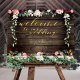 An extra large 54 by 40 inch poster board with a rustic vintage reclaimed barn board wood background. A bough of deep burgundy and blush pink florals cascade amongst silver greenery garlands and romantic candle-lit floral bouquets bursting with peony flowers and sprays of floral artistry.