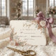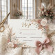 This design utilizes a sophisticated, formal layout centered around delicate watercolor illustrations of dusty rose blossoms and muted green eucalyptus leaves. The composition sits on a soft cream background , establishing a warm, inviting contrast with the elegant, sweeping script used for the primary headline and the highly legible classic serif font for the event details.This is a flat printed image with a faux metallic foil effect, not actual raised material.