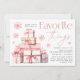 Invite friends to a Christmas or holiday themed favourite things party with this elegant and festive invitation, featuring watercolor illustrations in soft shades of blush pink. Your favourite things party details are flanked by a tower of wrapped Christmas gifts in blush pink watercolor, with cascading pink snowflakes. Personalise with your party details, including instructions for your guests on how many gifts to bring and their estimated value.