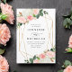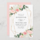 Elegant floral wedding invitations featuring your wedding details surrounded by a faux gold foil geometric frame adorned with bouquets of blush pink watercolor roses and tulips with lush green and copper leaves at the top and bottom. The floral wedding invitations reverse to a light blush pink background. Designed to coordinate with our Blush Spring Floral wedding collection.