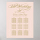 Elegant gold calligraphy script wedding seating chart poster design features a monogram of the bride and groom names and wedding date and custom template text for table numbers and guest names. Colours include blush pink and champagne gold.