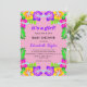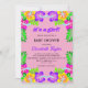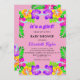 This elegant tropical baby shower invitation is perfect for a modern summer baby shower. The simple design features bloom yellow, purple, and pink flowers with elegant black typography on a blush pink background.