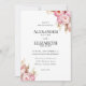 This wedding invitation features a border of pink peony illustrations with green leaves at two opposite corners against a clean white background enhances the floral beauty.