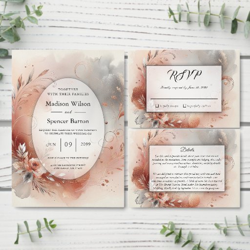 Invite your guests to a day of timeless romance with this elegant wedding invitation from the 'Blushing Petals and Silver Swirls' collection. Featuring soft watercolor florals in muted blush and terracotta, delicate silver and gold swirls, and a graceful wash of neutral tones, this design blends modern luxury with artistic charm. Perfect for weddings that embrace understated beauty and warm sophistication, it sets the tone for a celebration that’s both refined and deeply romantic.