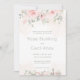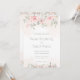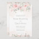 A blush pink watercolor painted wedding invitation featuring blush pink roses and silver eucalyptus greenery with blush pink watercolor wash background.