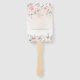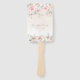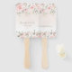 A blush pink wedding hand fan featuring watercolor painted blush pink roses with silver eucalyptus greenery and a soft watercolor wash background.