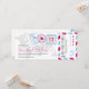 A boarding pass inspired ticket invitation with fun passport stamp details and airmail stripes. Shown in shades of Bright Pink, Pastel Blue, Dark Grey and Light Grey. Back side includes extra space for any hotel, travel or website information.