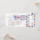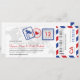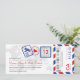 A boarding pass inspired ticket invitation with fun passport stamp details and airmail stripes. Shown in shades of Bright Red, Royal Blue, Dark Grey and Light Grey. Back side includes extra space for any hotel, travel or website information.