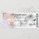 Boarding pass wedding ticket featuring a photo of the happy couple, a silver foil destination world map, compass, aeroplane, and a personalised wedding template.