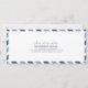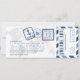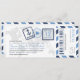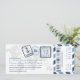 A boarding pass inspired ticket invitation with fun passport stamp details and airmail stripes. Shown in shades of Navy, Powder Blue, Dark Grey and Light Grey. Back side includes extra space for any hotel, travel or website information.
