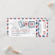 A boarding pass inspired ticket invitation with fun passport stamp details and airmail stripes. Shown in shades of Navy, Red, and Gray. Back includes extra space for any hotel, travel or website information.