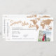 Boarding Pass Save the Date Card with an elegant faux copper rusty bronze foil world map, modern boho fonts, and 2 photos with abstract geometric borders around them. You can use this template to create your own unique travel theme destination wedding date announcement, leave the design as-is, or have some fun with DIY design using our layout.