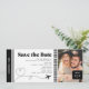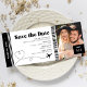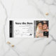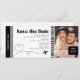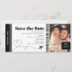 Modern boarding pass wedding ticket featuring a simple white background that can be changed to any colour, a photo of the engaged couple, a plane with a heart loop trail, and a personalised save the date template that is easy to personalise.