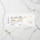 Boarding Pass Plane Ticket Save the Date Invitation Card with a small attached RSVP section for a Destination Wedding featuring a romantic aeroplane icon and faded gold world map background with modern elegant script fonts and back side with travel and accommodations information for guests to start planning their trip to celebrate your marriage in the middle of a vacation.