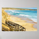 Pictured is a glorious view of a wooden boardwalk leading you down to golden sands below with aqua blue sea waters lapping the sand