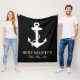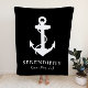 A chic modern nautical-themed black blanket for your boat that features a white illustration of an anchor. Monogram your boat's name and location in elegant white typography.
